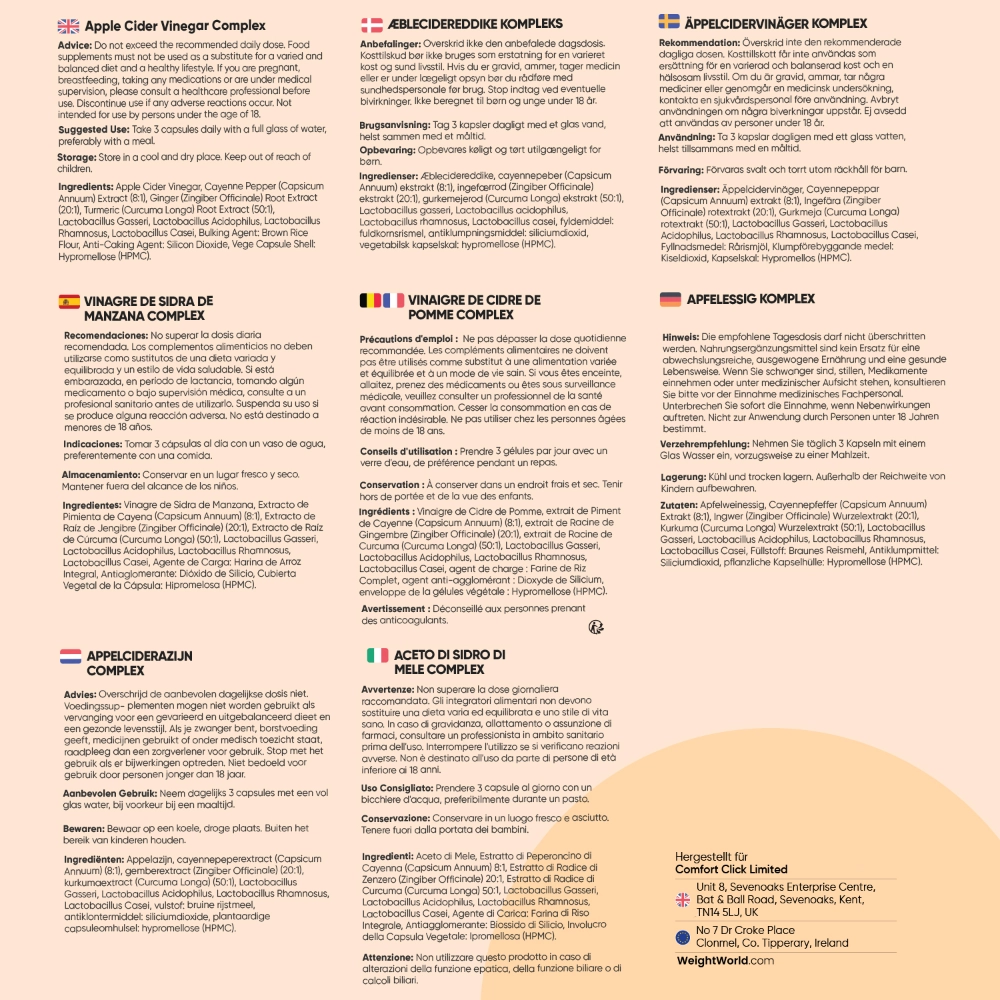 Appelazijn, cayennepeperextract (Capsicum Annuum) (8:1), gemberextract (Zingiber Officinale) (20:1), kurkumaextract (Curcuma Longa) (50:1), Lactobacillus Gasseri, Lactobacillus Acidophilus, Lactobacillus Rhamnosus, Lactobacillus Casei, vulstof: bruine rijstmeel, antiklontermiddel: siliciumdioxide, plantaardige capsuleomhulsel: hypromellose (HPMC).