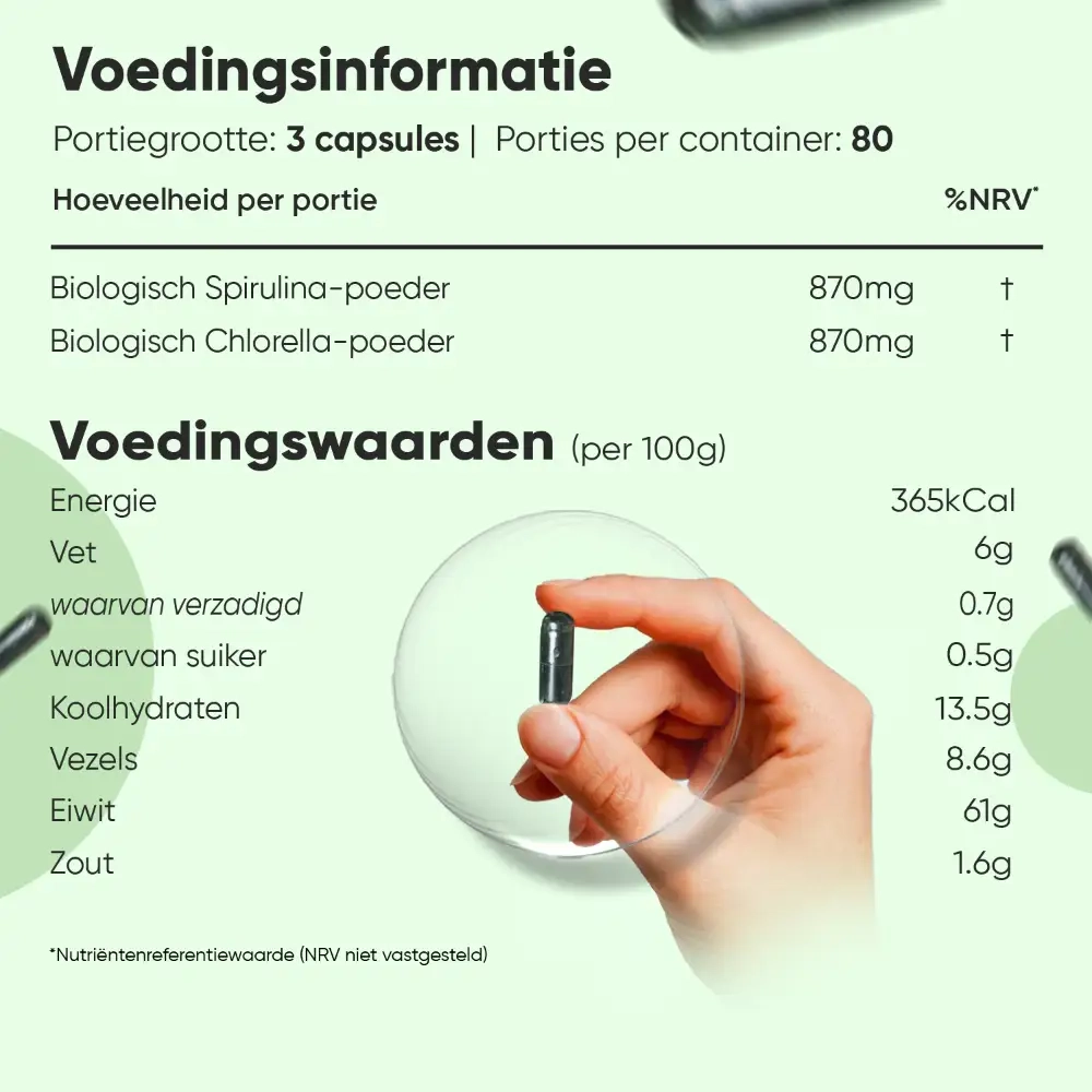 - 100% biologische chlorella en spirulina - combinatie van gecertificeerd biologische superfoods
