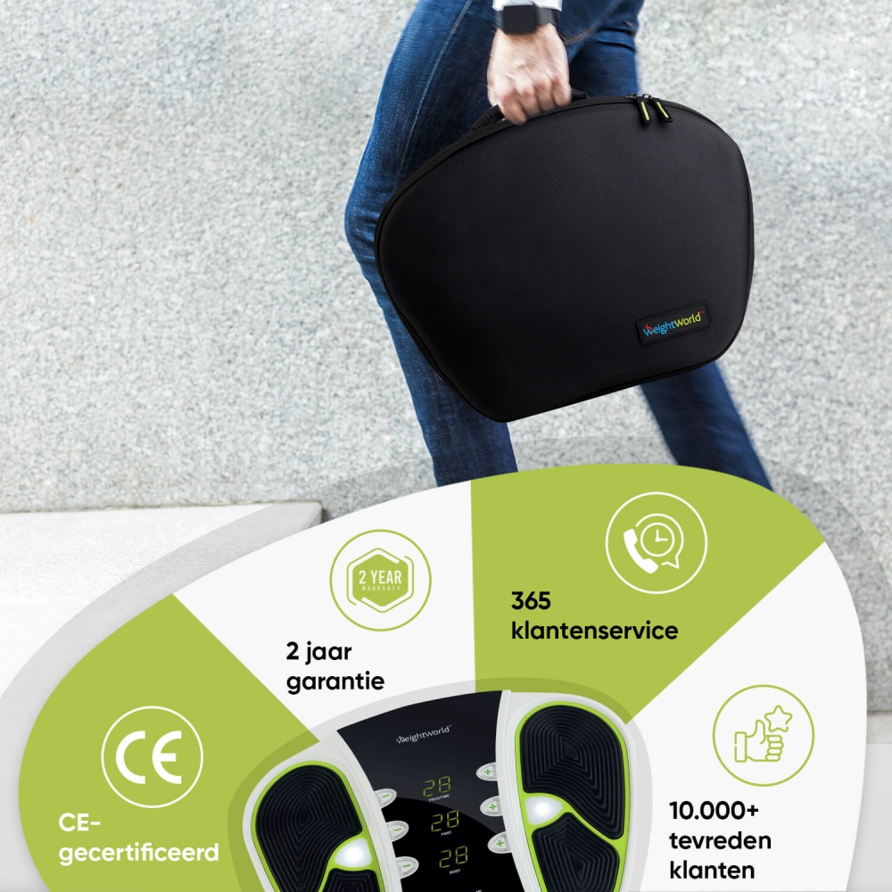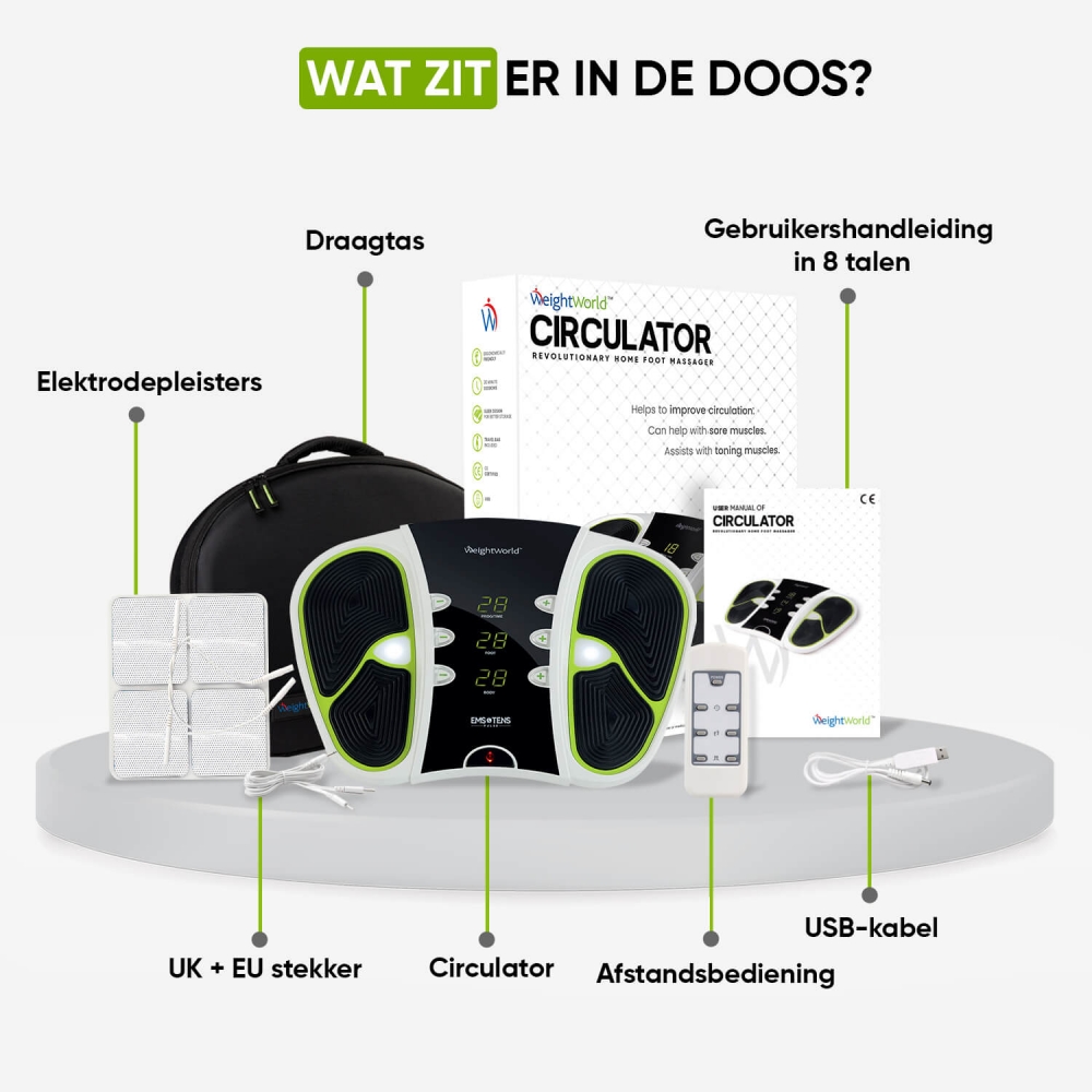 De WeightWorld Circulator is een krachtig bloedcirculatie apparaat om de doorbloeding in de benen te stimuleren. Dit veelzijdige apparaat wordt daarnaast geleverd met elektrodenpads om tegelijkertijd de spieren in je rug, schouders en armen te stimuleren. De Circulator van WeightWorld is ontwikkeld met EXOpulse-technologie, een vorm van EMS-technologie die milde, gereguleerde therapeutische elektrische impulsen via de voetzolen gebruikt om de spieren te laten samentrekken. Hoe meer de spieren samentrekken, hoe eenvoudiger de aders het bloed naar het hart kunnen pompen om de bloedsomloop te stimuleren.