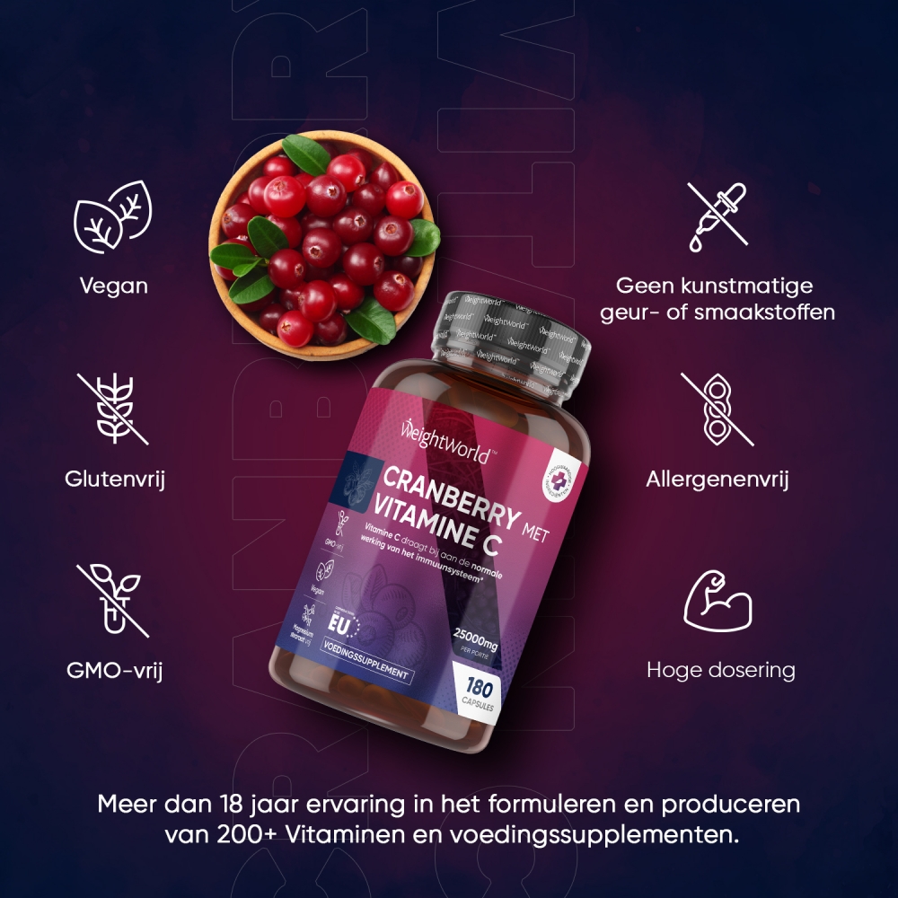 - Krachtige dosering van 25.000 mg cranberry per dosering