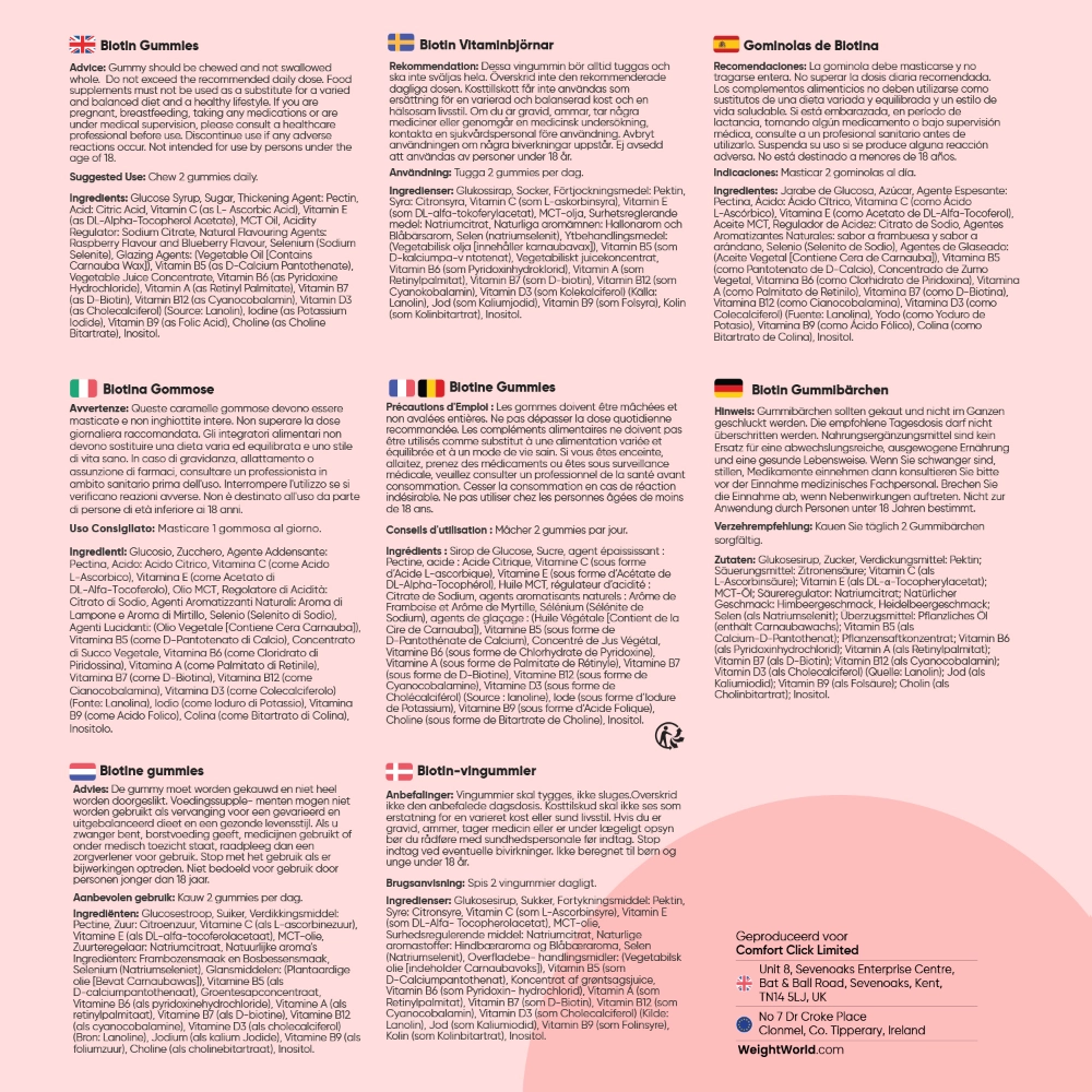Glucosestroop, Suiker, Verdikkingsmiddel: Pectine, Zuur: Citroenzuur, Vitamine C (als L-ascorbinezuur), Vitamine E (als DL-alfa-tocoferolacetaat), MCT-olie, Zuurteregelaar: Natriumcitraat, Natuurlijke aroma's Ingrediënten: Frambozensmaak en Bosbessensmaak, Selenium (Natriumseleniet), Glansmiddelen: (Plantaardige olie [Bevat Carnaubawas]), Vitamine B5 (als D-calciumpantothenaat), Groentesapconcentraat, Vitamine B6 (als pyridoxinehydrochloride), Vitamine A (als retinylpalmitaat), Vitamine B7 (als D-biotine), Vitamine B12 (als cyanocobalamine), Vitamine D3 (als cholecalciferol) (Bron: Lanoline), Jodium (als kalium Jodide), Vitamine B9 (als foliumzuur), Choline (als cholinebitartraat), Inositol.