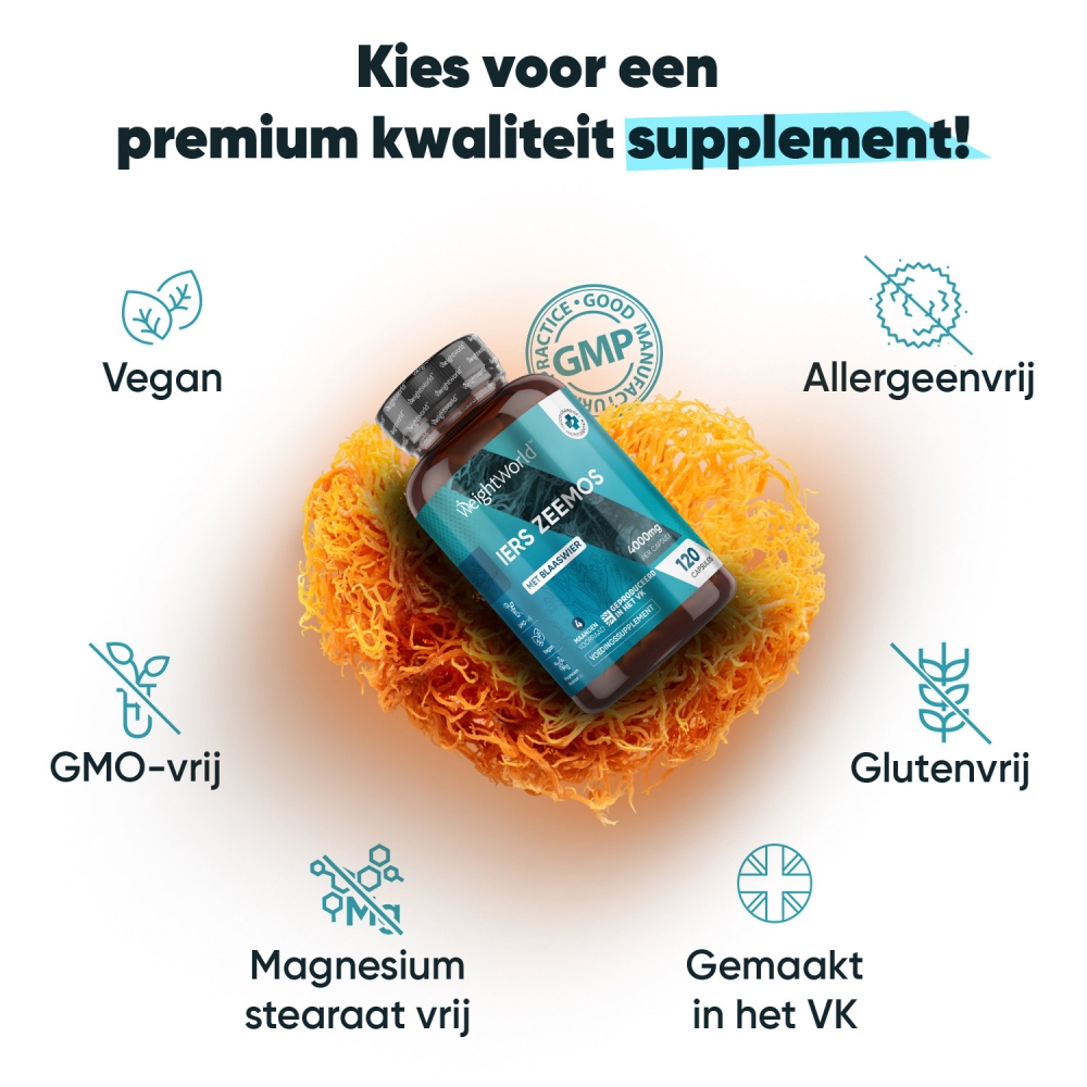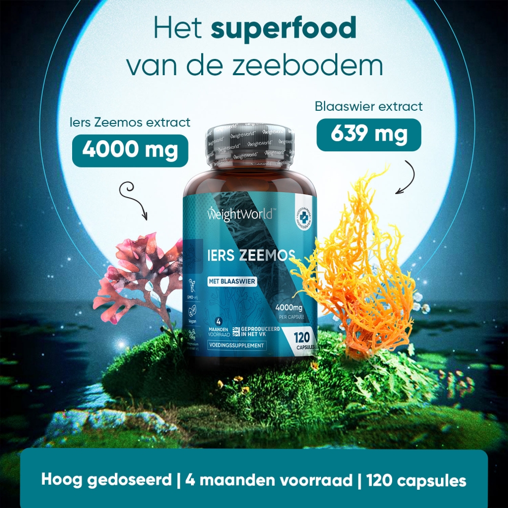 Daarnaast heeft het supplement een krachtige dosering van 4000 mg Iers zeemos per capsule. Elke verpakking bevat 120 Irish Sea Moss capsules, zodat je langdurig kunt profiteren van de voordelen van dit bijzondere zeewier.