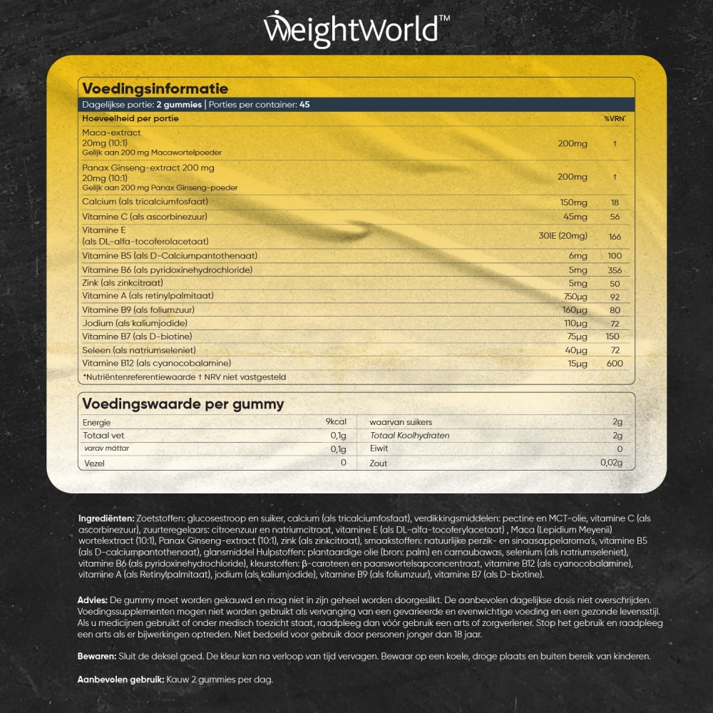Elke dagelijkse dosis multivitaminen & mineralen gummies bevat ook 200 mg maca-extract en 200 mg panax ginseng extract. Maca is een kruidachtige plant uit Peru dat al eeuwenlang wordt gebruikt in de geneeskunde. Het is goed voor het libido* en voor het energieniveau*. Ginseng is ook een kruid dat al eeuwenlang wordt gebruikt in de traditionele geneeskunde dat het afweersysteem ondersteunt* en goed is voor het geheugen* en de concentratie*. Daarnaast is ginseng ook goed voor het libido* en helpt het bij vermoeidheid*.