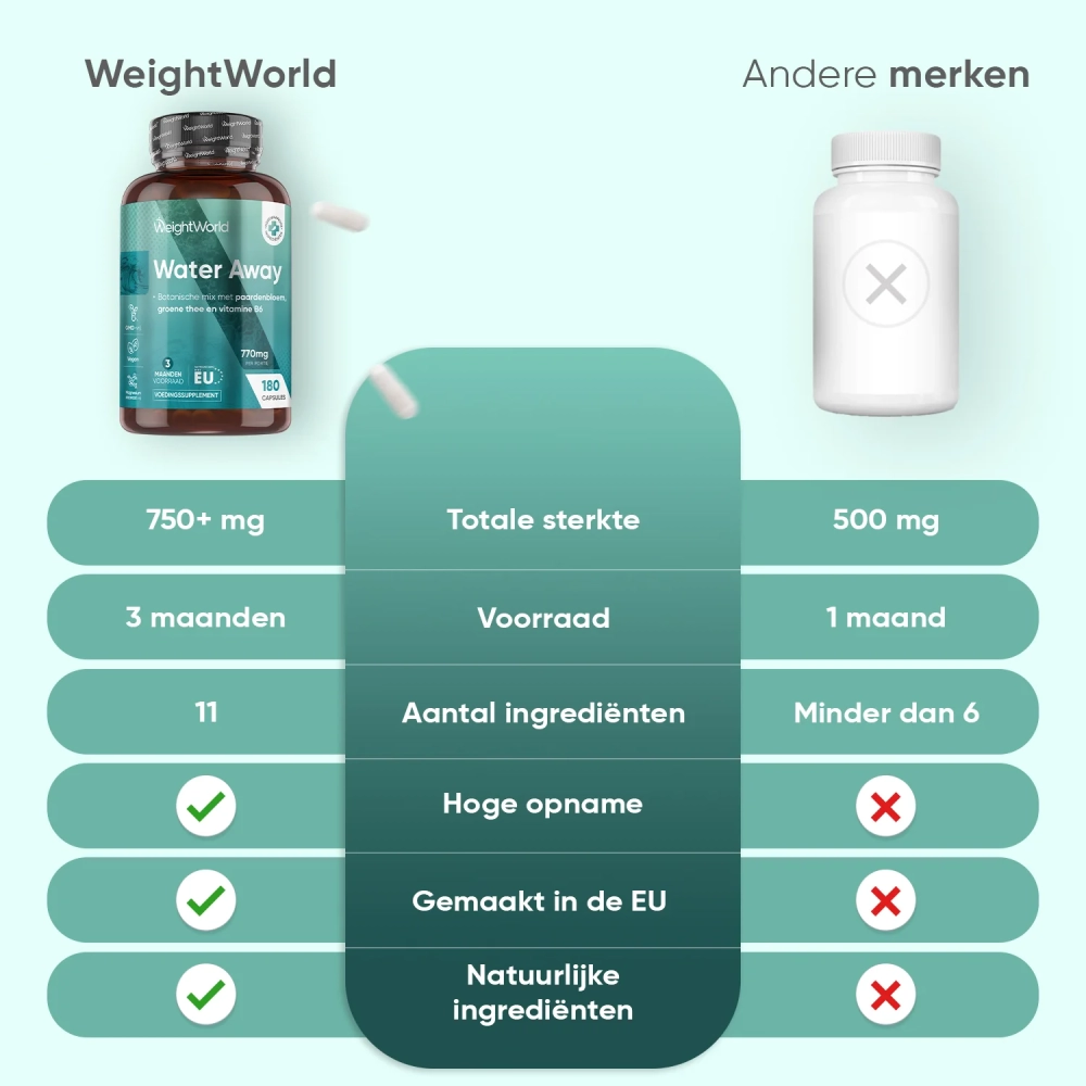 Water Away capsules zijn vochtafdrijvende pillen gemaakt van 11 plantaardige vitamines, ingrediënten en mineralen, zoals onder andere: vitamine B6, kalium, buchu blad, paardenbloem, groene thee en jeneverbessen. Deze combinatie van natuurlijke ingrediënten biedt een ideaal alternatief voor chemische varianten of andere plaspillen.