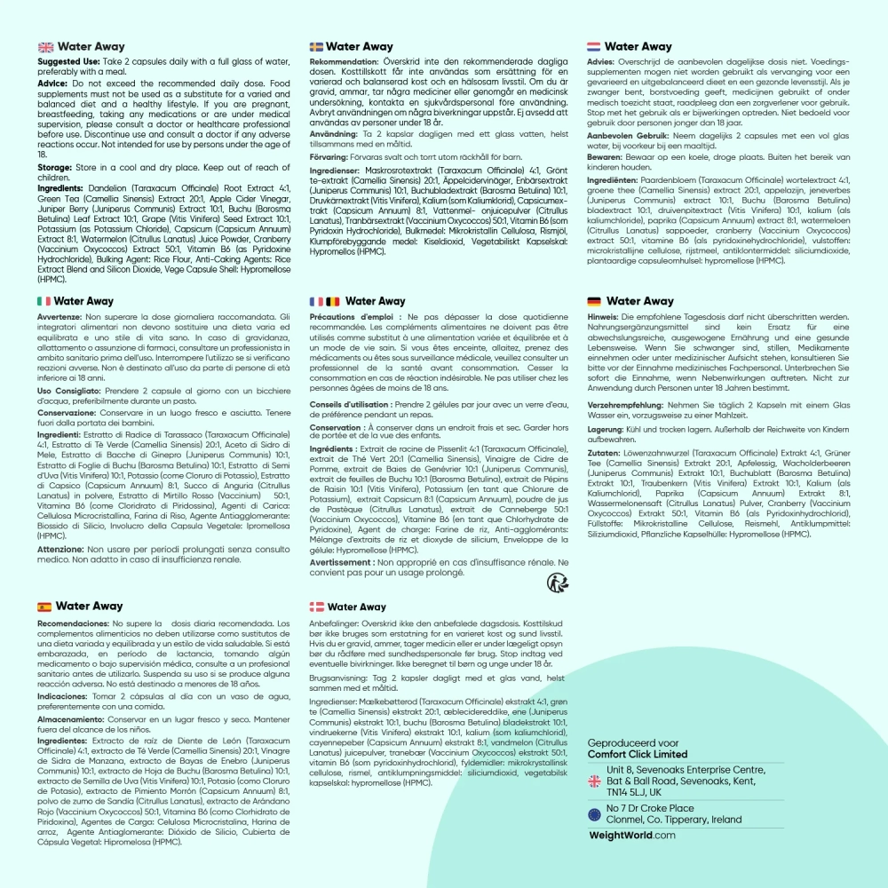Water Away is volledig vegan, glutenvrij en geproduceerd onder strenge eisen binnen de EU. Met 180 capsules per verpakking beschik je over een voorraad van 3 maanden.